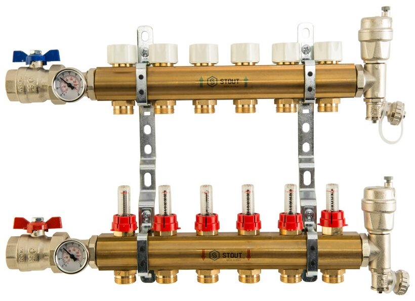 STOUT Distribution manifold 8 circuits made of brass with flowmeters