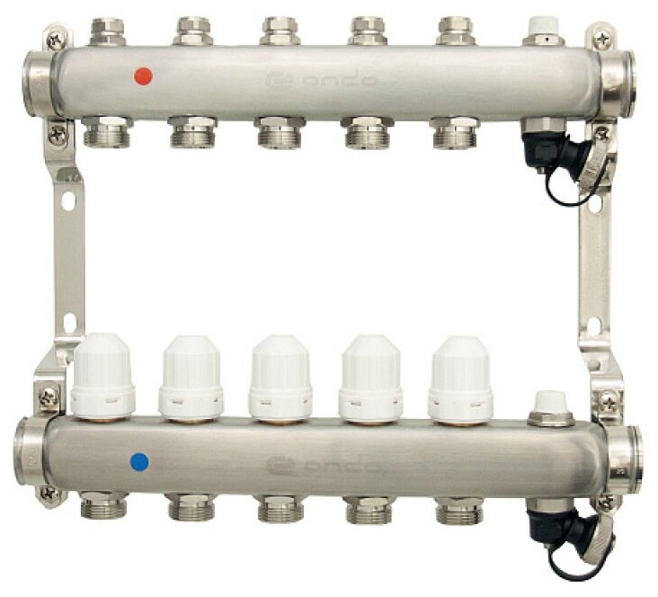 Supply manifold - 1 pc, return manifold - 1 pc, shut-off valve - 5 pcs, thermostatic valve - 5 pcs, Eurocone fitting - 10 pcs, air vent - 2 pcs, drain cock - 2 pcs, bracket with fastening - 2 pcs.