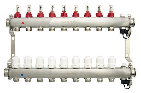 Supply manifold - 1 pc, return manifold - 1 pc, air vent - 2 pcs, drain cock - 2 pcs, mounting bracket - 2 pcs, flow meter - 9 pcs, thermostatic valve - 9 pcs, euroconus fitting - 18 pcs