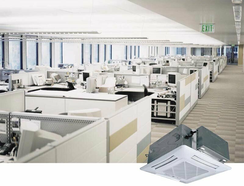 Type: indoor unit, indoor unit type: cassette, room area: 110 m², inverter, additional modes: ventilation, night, features: decorative panel included, remote control, on/off timer