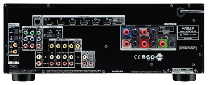 Stereo line-in, digital optical input, digital coaxial input, headphone output, subwoofer output, USB Type A, HDMI output, HDMI input x6