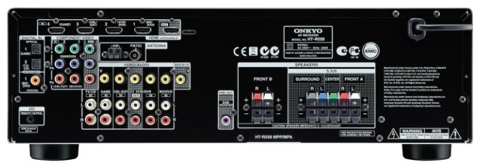 Stereo line-in, multi-channel line-in, digital optical input, digital coaxial input, headphone output, subwoofer output, HDMI output, HDMI input x4