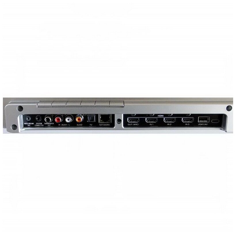 Stereo line-in, digital optical input, digital coaxial input, subwoofer output, HDMI output, HDMI input x3