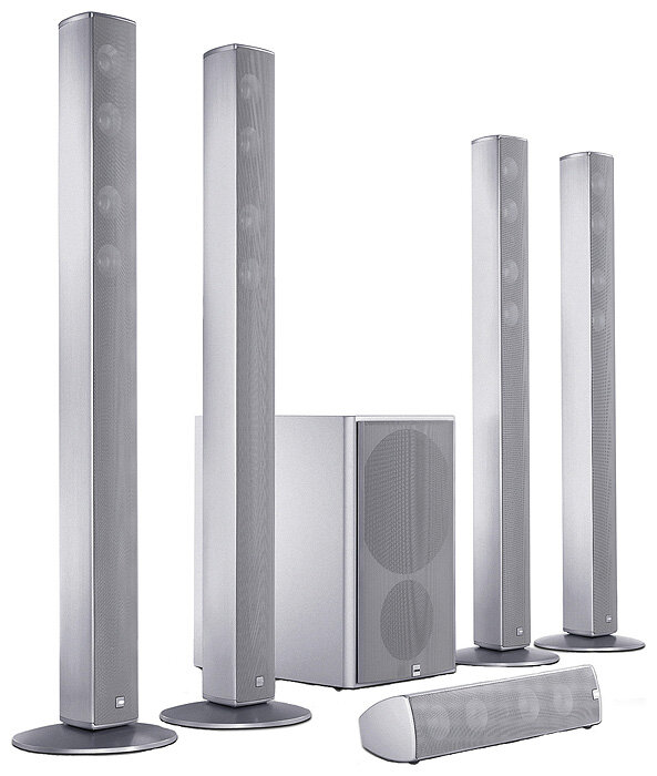 Acoustic set consisting of front and rear speakers CD 100, speakers of the center channel CD 50, active subwoofer CS 25 SC. The color is silver.