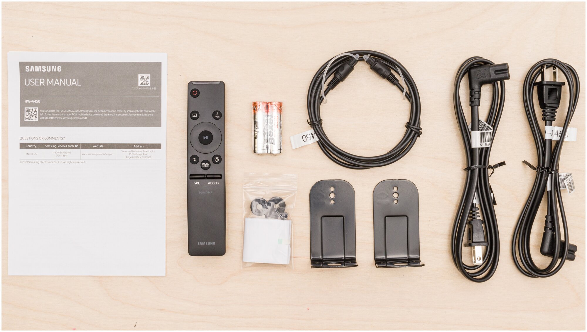 Equipment: Samsung HW-A450 soundbar, wall mount bracket, remote control, batteries for remote control