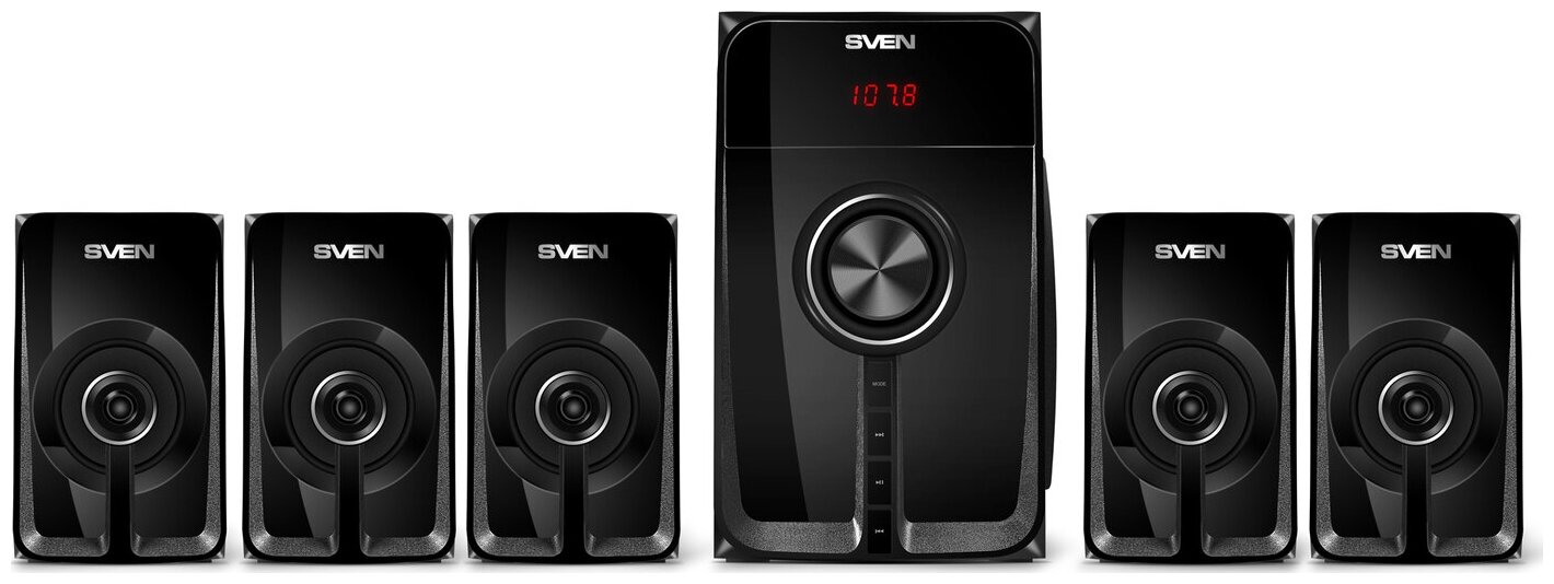 SVEN HT-202, black, speaker system 5.1 RMS power:20W+5x16W, Bluetooth, FM tuner, USB/SD, display, remote control