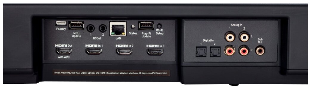 Stereo line-in, digital optical input, subwoofer output, HDMI output, HDMI input x3