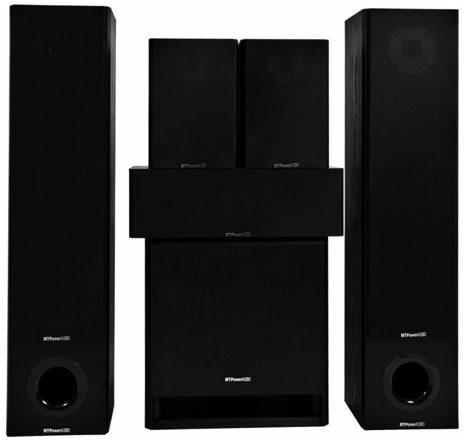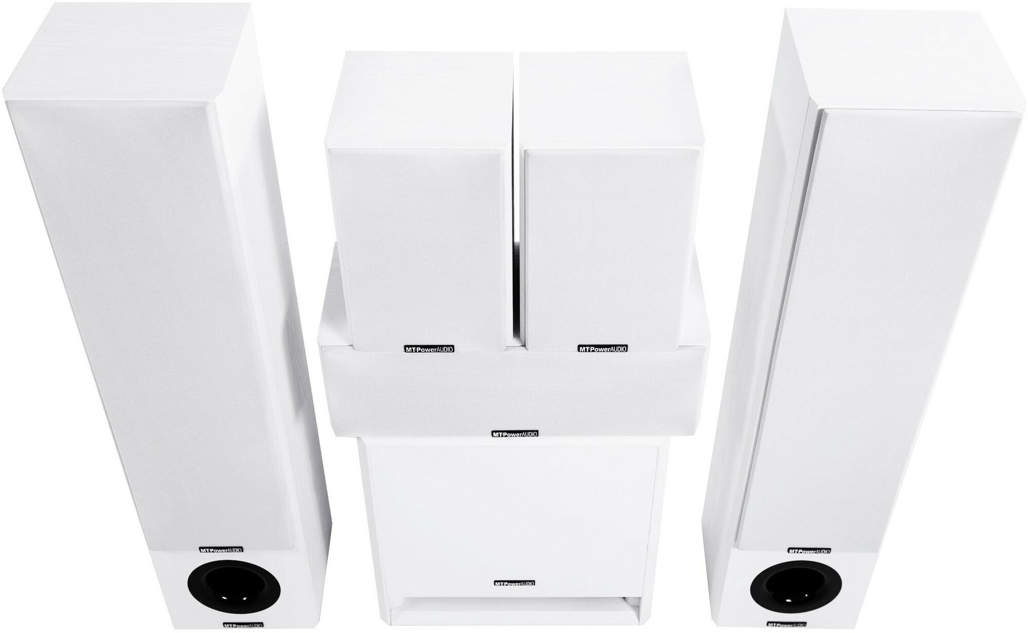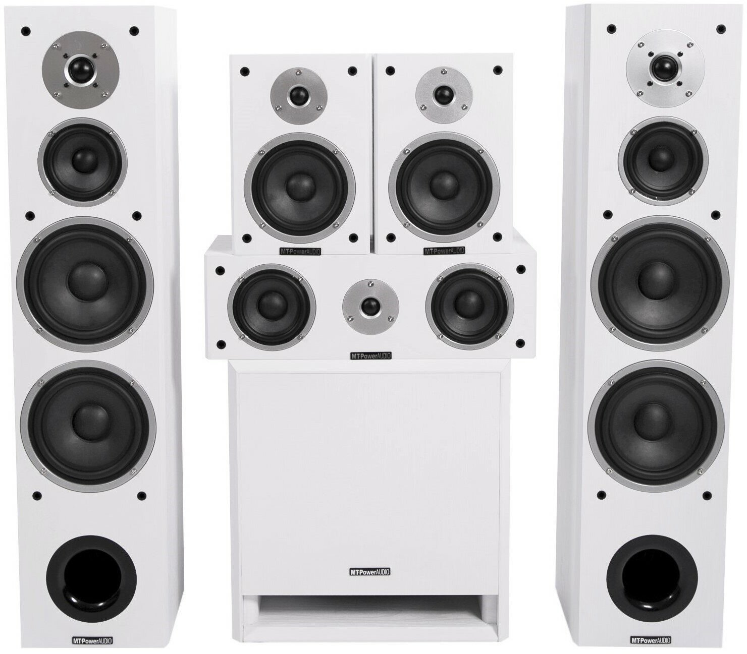 Set consists of 2x MT-Power Performance Front speakers, 2x MT-Power Performance Rear speakers, MT-Power Performance Center center channel and MT-Power Blust 2 active subwoofer
