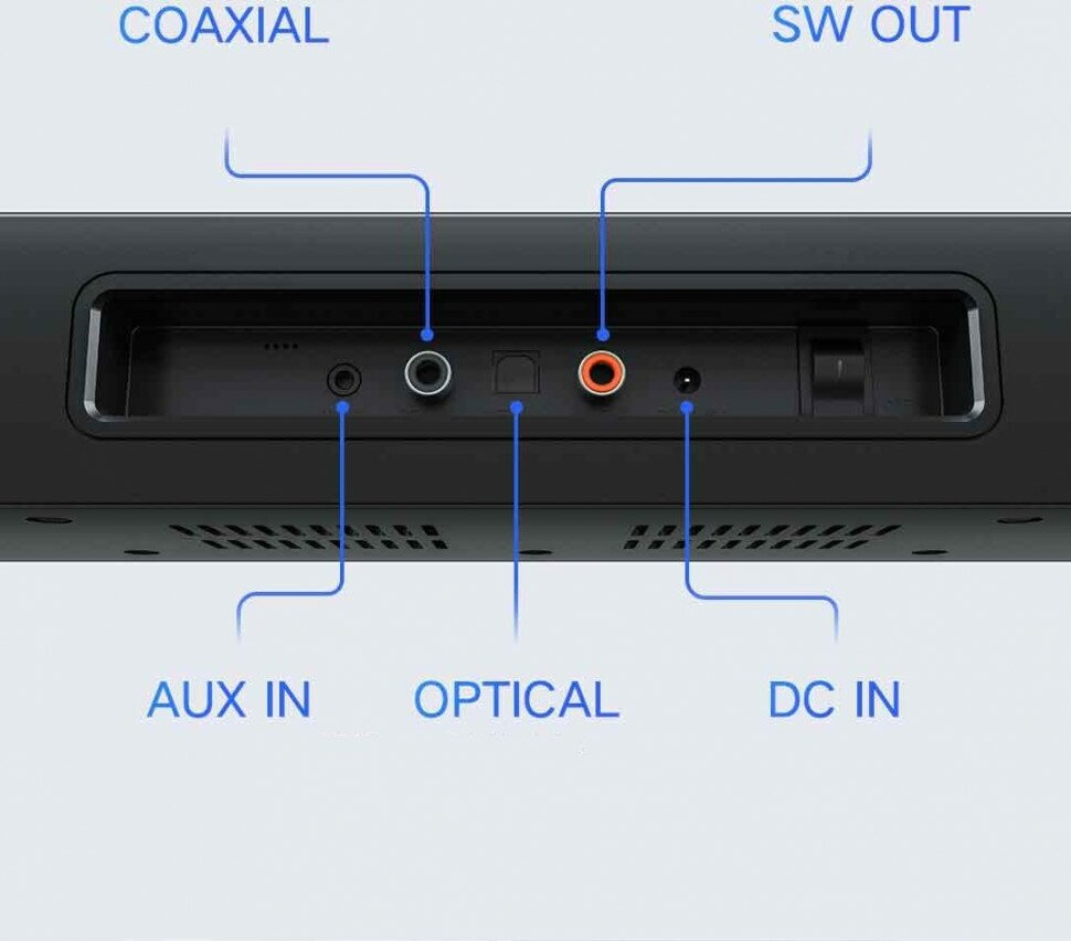 Stereo line-in, digital optical input, digital coaxial input, subwoofer output
