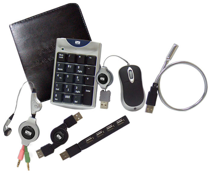 The set includes: USB numeric keyboard for quick and easy information entry; USB lamp that allows you to work at night; optical USB mini mouse with foldable wire; stereo headset with microphone for use