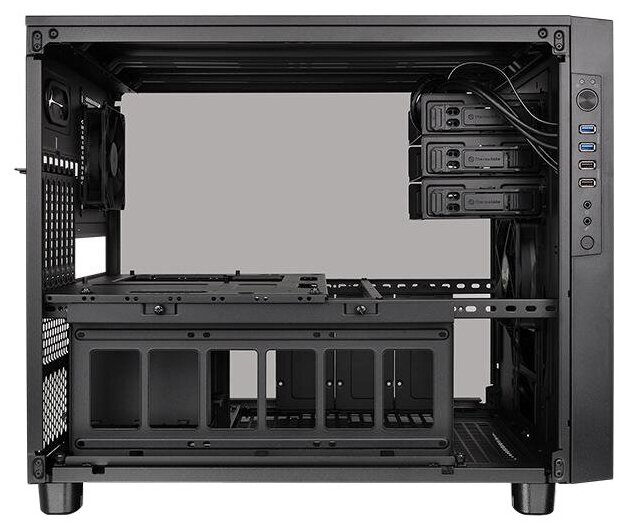 3.5 bays are compatible with 2.5 media; space for six 120 mm or four 140 mm or two 200 mm fans on top, six 120 mm on the bottom, and three 120 mm on the side. Possibility of installing up to three 120 mm or two 140 mm or one 200 mm