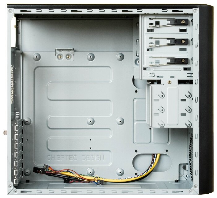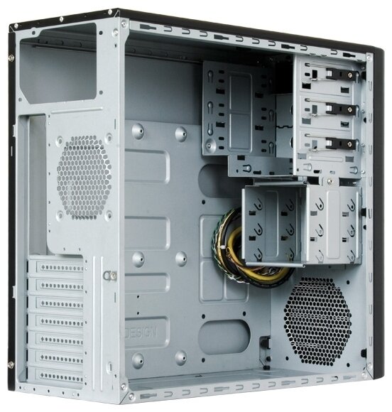 Screwless mounting of 5.25 devices; space for 92 mm fan in the back, two 120 mm fans in the side and one in the front