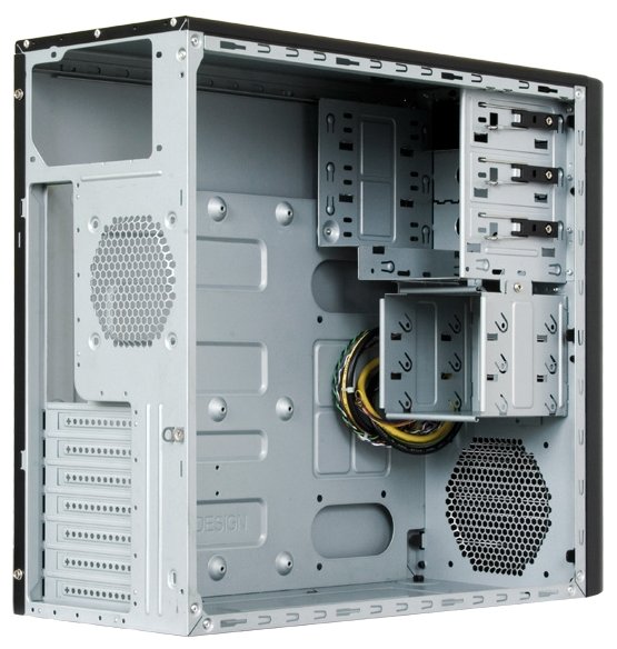Screwless mounting of 5.25" devices; space for a 92 mm fan in the rear, two 120 mm fans on the left and one 120 mm fan on the front