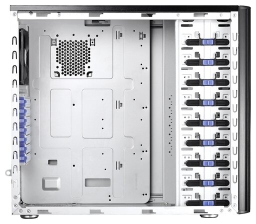 One of the 5.25-inch bays can be converted into a 3.5-inch bay for installing a floppy drive; there is a removable module for four 3.5-inch drives; its installation occupies three 5.25-inch bays; V