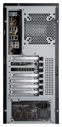 FireWire on the front panel is optional, space for 120 mm or 140 mm fans on the top and side, one 5.25-inch bay converts to a 3.5-inch