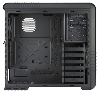 Space for two 120/140 mm fans on the top and left, two 120 mm fans on the bottom and one on the HDD cage, one 80 mm fan on the right