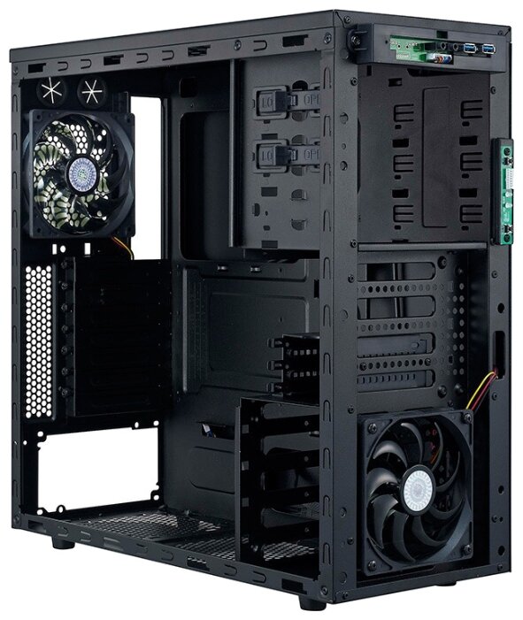 Screwless mounting of 5.25" devices; space for one 120 mm fan on the bottom and on the HDD cage and for two 120/140 mm fans on the top