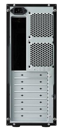 Space for one 80/92/120 mm fan on the side; vertical and horizontal arrangement of the body; screwless mounting for 3.5 devices; power supply behind the front panel