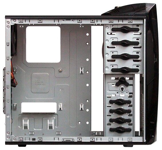 Space for one 120/140 mm fan on the side, for one 120 mm fan in the front and bottom; three 5.25 compartments transform into 3.5; one external 3.5 bay via adapter