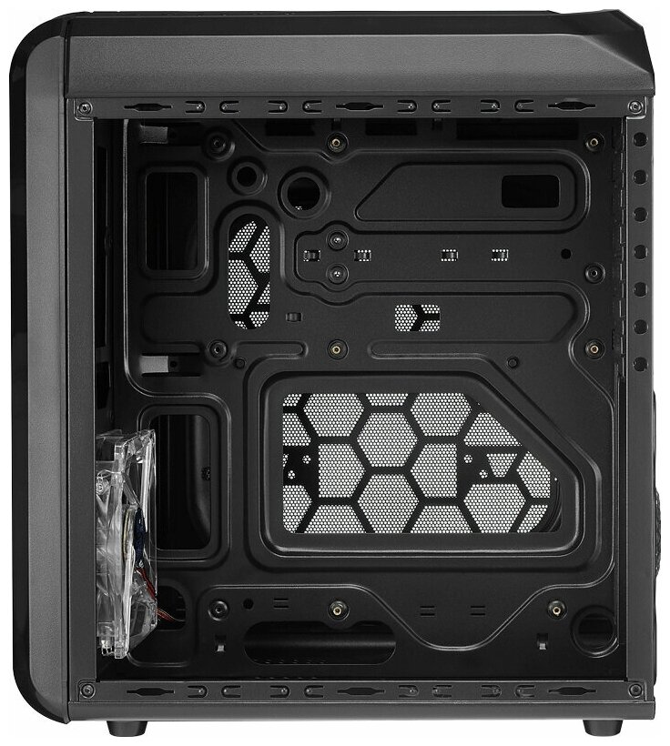 Switching the color of the front cooler illumination; space for an 80 mm fan at the rear, for a 120 mm fan - one at the top, front and bottom