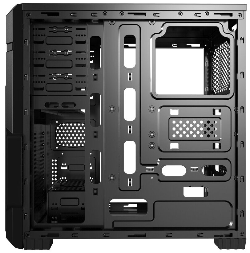 Space for a 120 mm fan on the front and side; screwless mounting of 5.25" devices