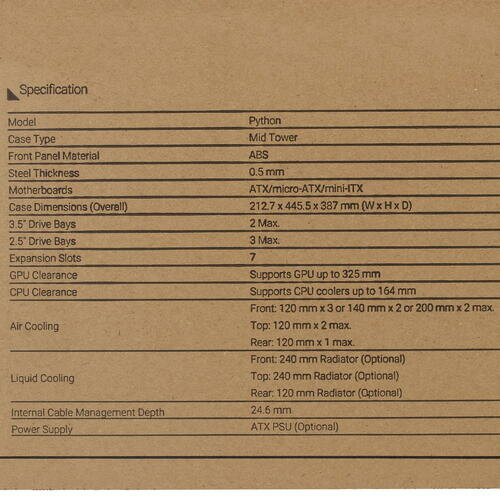 Additional Information: Space for two 120 mm fans on top; radiator support
