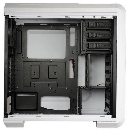 Adjustable HDD cage rail for installing four 2.5/3.5 media; space for one 120 mm fan at the front and bottom and two at the top