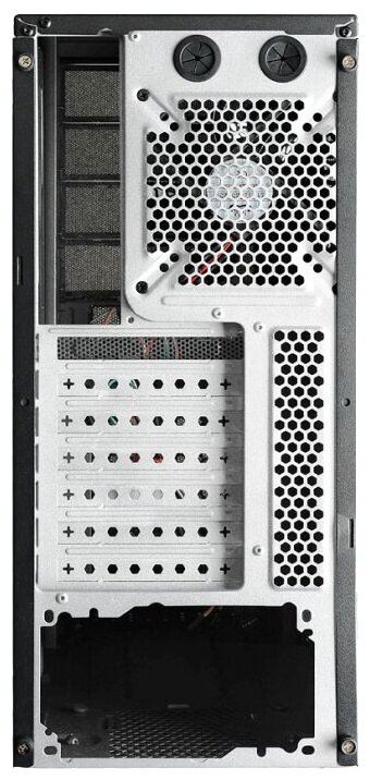 Two adapters for installing 2.5/3.5" drives in 5.25" bays; space for two 120/140 mm fans on the left and one 120 mm in the front; Screwless mounting in 5.25" bays