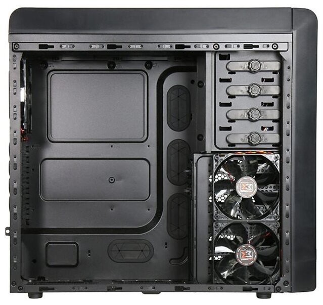 Space for two 120 mm fans on the right side of the HDD cage, two 120/140 mm fans on the top and one on the bottom; Screwless mounting of 5.25" devices