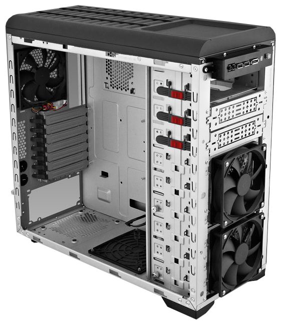 Two removable baskets for internal 3.5 devices; installation of up to 8 internal 3.5 devices; adapter for installing an external 3.5 bay into a 5.25 bay; adapter for installing an internal 2.5 bay into a 5.25 bay; spaces for 80 mm, 92 mm, 120 mm