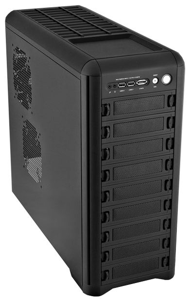 Two removable baskets for internal 3.5 devices; installation of up to 8 internal 3.5 devices; adapter for installing an external 3.5 bay into a 5.25 bay; adapter for installing an internal 2.5 bay into a 5.25 bay; spaces for 80 mm, 92 mm, 120 mm