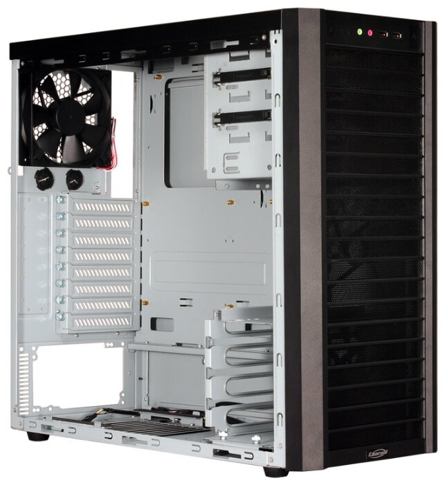 Space for two 120/140 mm fans on the side; screwless mounting of 5.25" devices