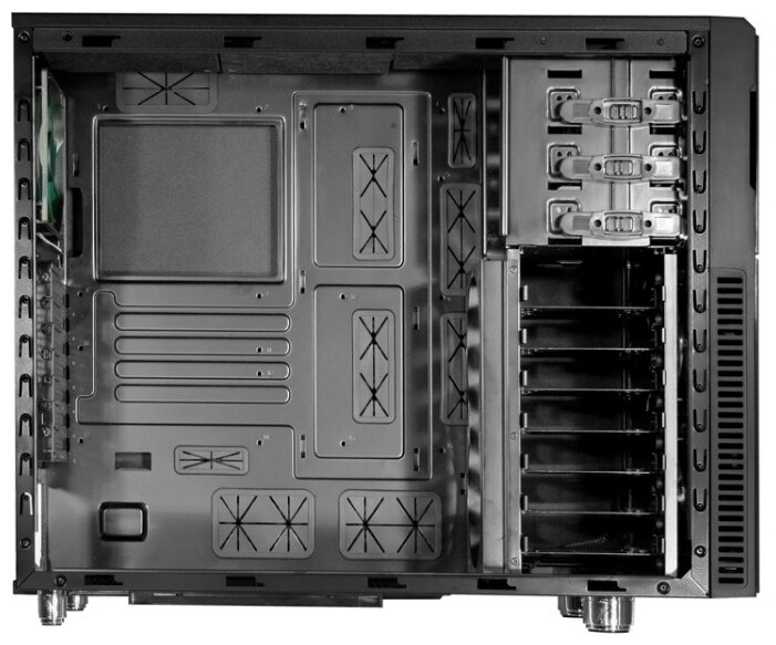 Space for 120 mm fans, two in front and on the HDD cage, two 120/140 mm fans on the top and one on the bottom; adapter for installing a 3.5 external device into a 5.25 bay; Screwless mounting of 5.25 devices