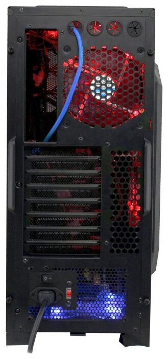 Screwless mounting of 5.25" devices; button to turn off the LED backlight; space for a 120 mm fan at the bottom; removable hard drive cage