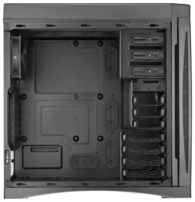 Space for one 230/200 mm or two 140/120 mm fans on top, one 140/120 mm on the bottom and one 120 mm on the front; multi-colored illumination of the bottom of the case