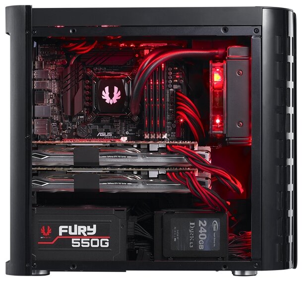 Space for a 120 mm fan in the front; 3.5" bays are compatible with 2.5" media; radiator support