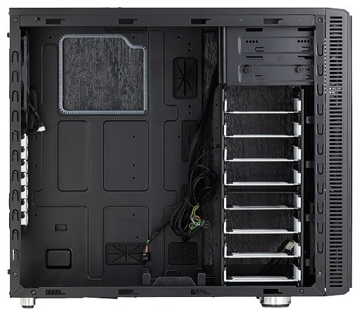 Adapter to 5.25 bay for installing 3.5 devices; space for a second 120 mm fan in the front, for one 120/140 mm fan on the bottom and side, and for two 120/140 mm fans on the top