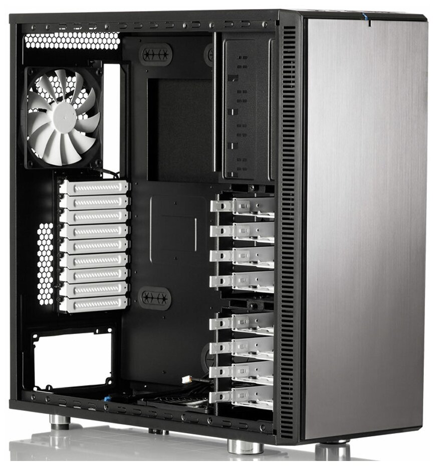 HDD mounting on a skid; space for a 140 mm fan - on the side, for one 120/140 mm fan - in the front and for two - on the top