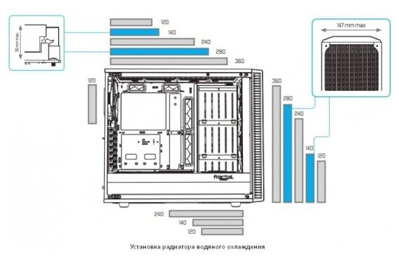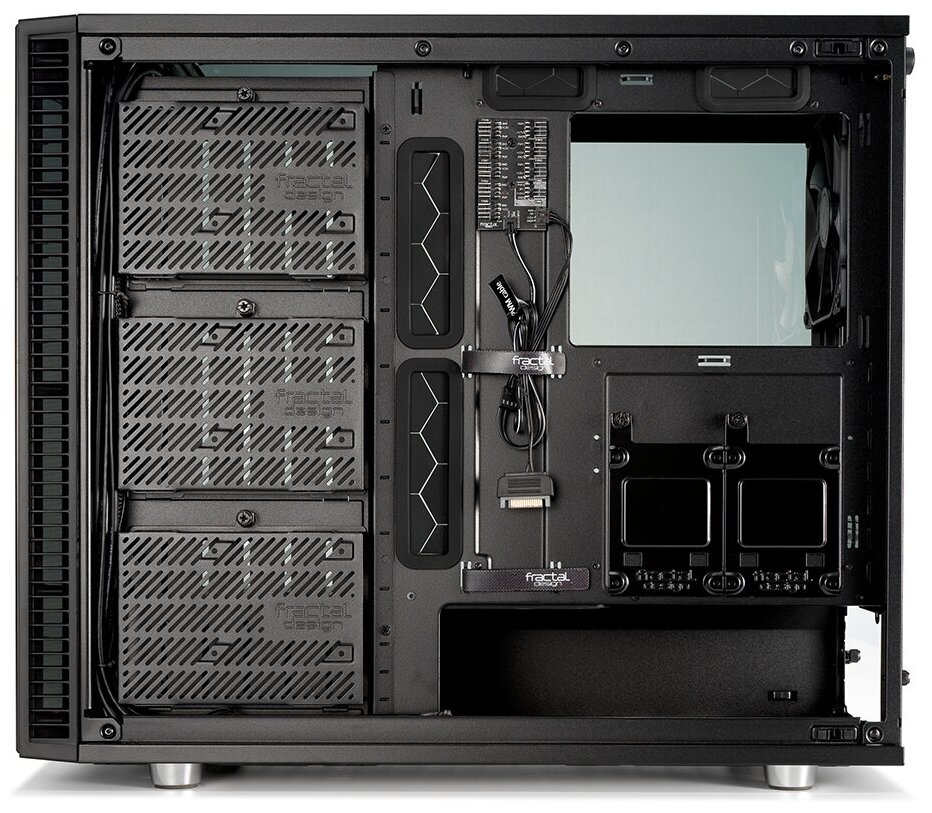 Space for three 120/140 mm fans on top, for two on the bottom; support for cooling radiators; 3.5" bays are compatible with 2.5" media