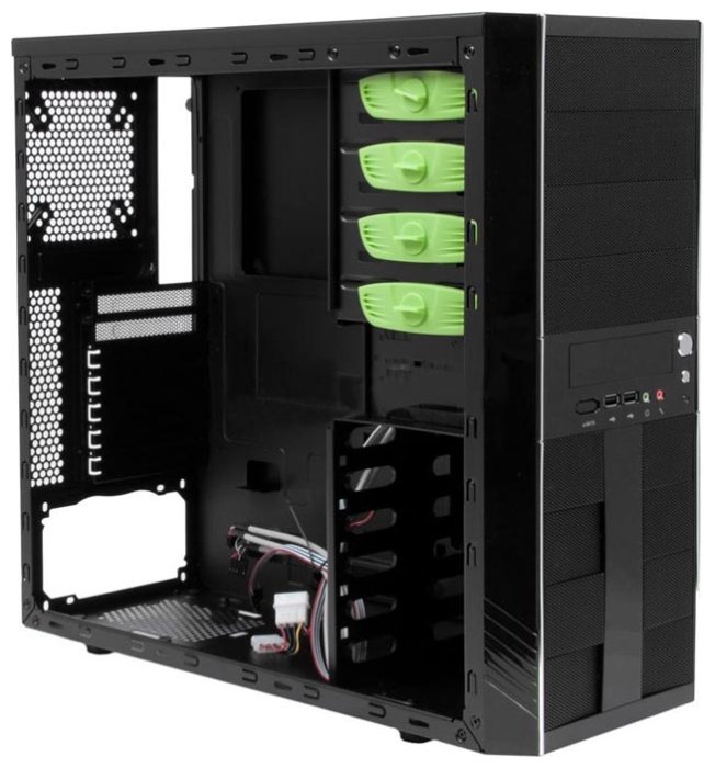 Screwless mounting of 5.25" devices; e-Sata on the front panel is optional; space for one 80/92/120 mm fan in the back, two on the side and one 120/140 mm fan on the top
