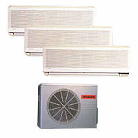 Three indoor units, sleep mode, three-speed fan, air purifying and deodorizing filters, programmable 24-hour timer; fan speed controller