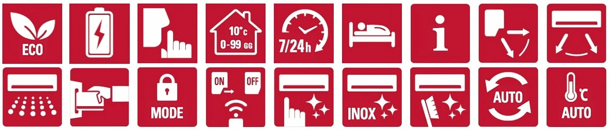 Motion sensor, operation indication, remote control, air flow direction adjustment, on/off timer, Auto cleaning, Anti-corrosion coating, Mold prevention, Off timer