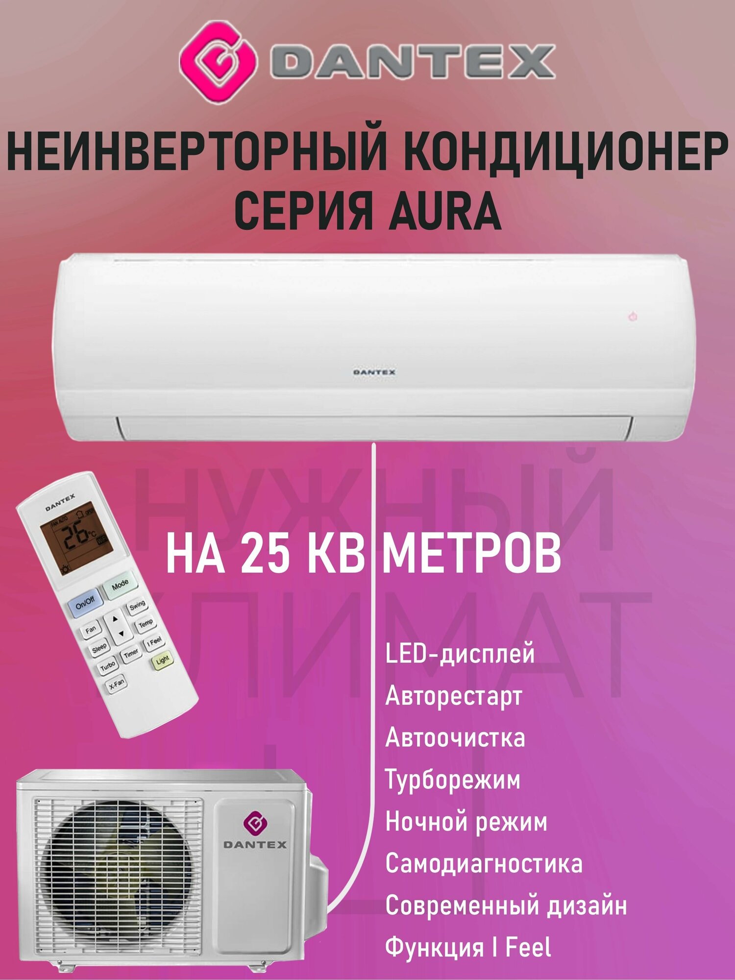 Air conditioner type: split system, room area: 21 – 30 m², air conditioner power BTU: 9, operating mode: heating, cooling, dehumidification, additional modes: ventilation, night, dehumidification, turbo, Automatic mode, Night