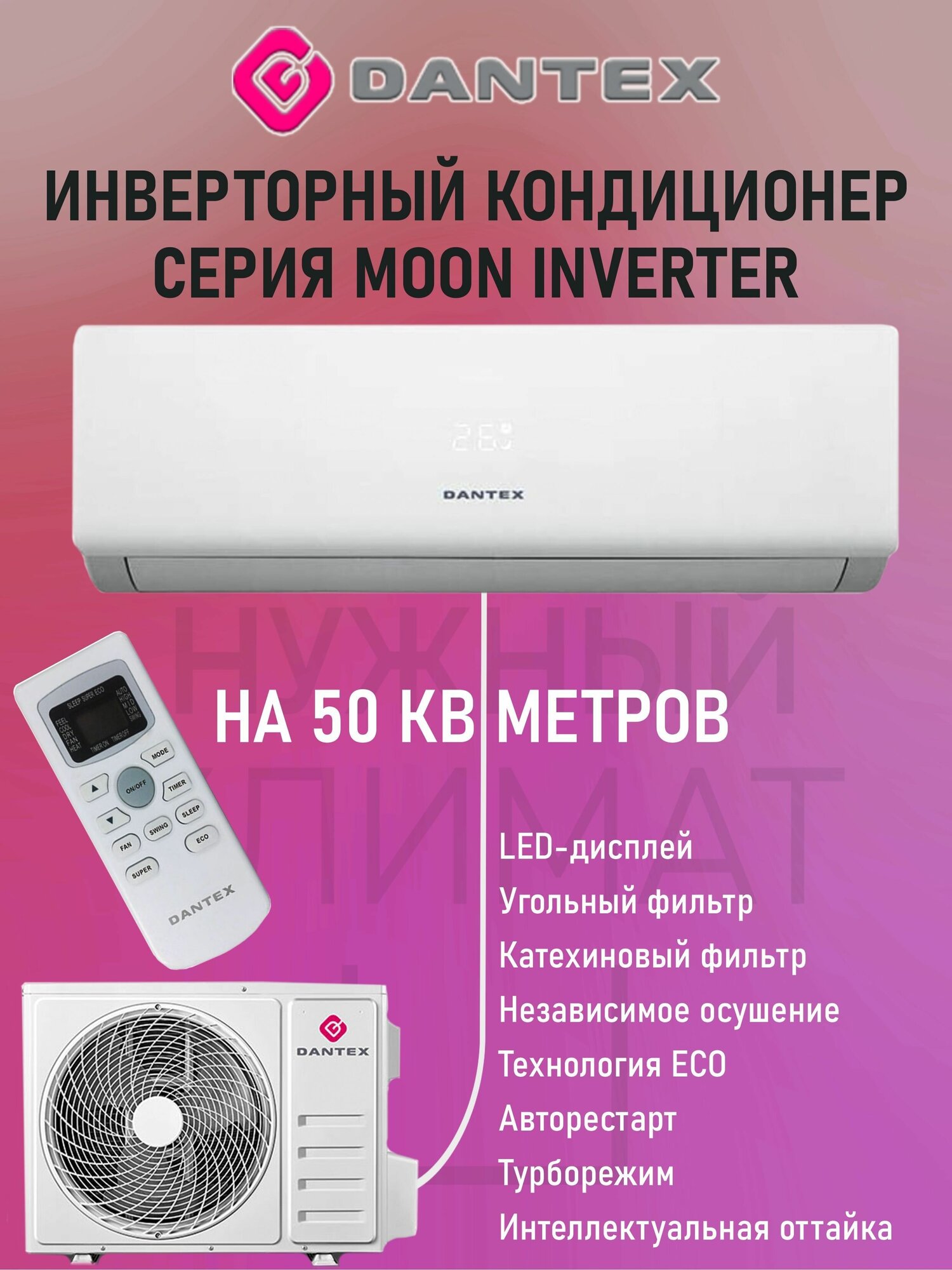 Air conditioner type: split system, room area: 31 – 54 m², inverter, Air conditioner power BTU: 18, operating mode: heating, cooling, Dehumidification, additional modes: ventilation, night, dehumidification, turbo, Automatic