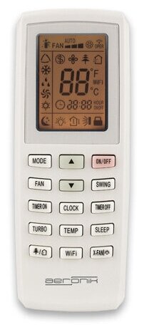 Display, remote control, air flow direction adjustment, on/off timer, control from a smartphone