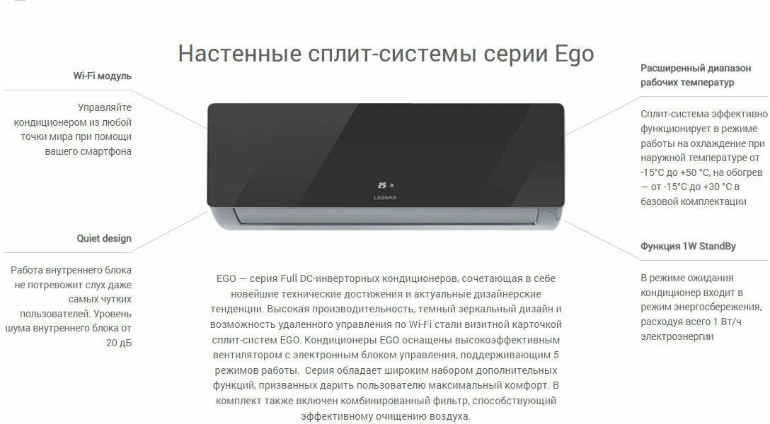 Display, winter kit, remote control, air flow direction adjustment, on/off timer, Wi-Fi module, Auto-cleaning, Auto-restart, Anti-corrosion coating, Air ionization, Prevention of formation