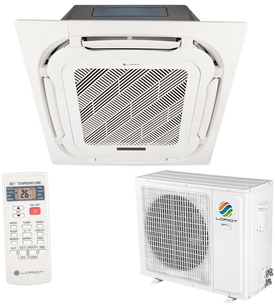 Air conditioner type: cassette, room area: more than 120 m², air conditioner power BTU: 48, operating mode: heating, cooling, additional modes: ventilation, night, dehumidification, features: remote control, direction adjustment