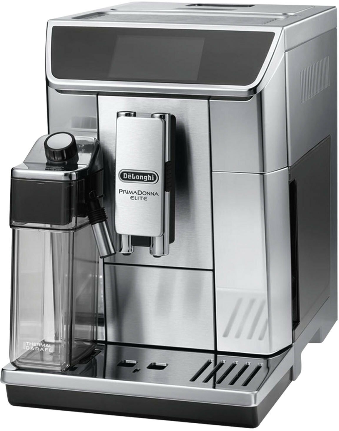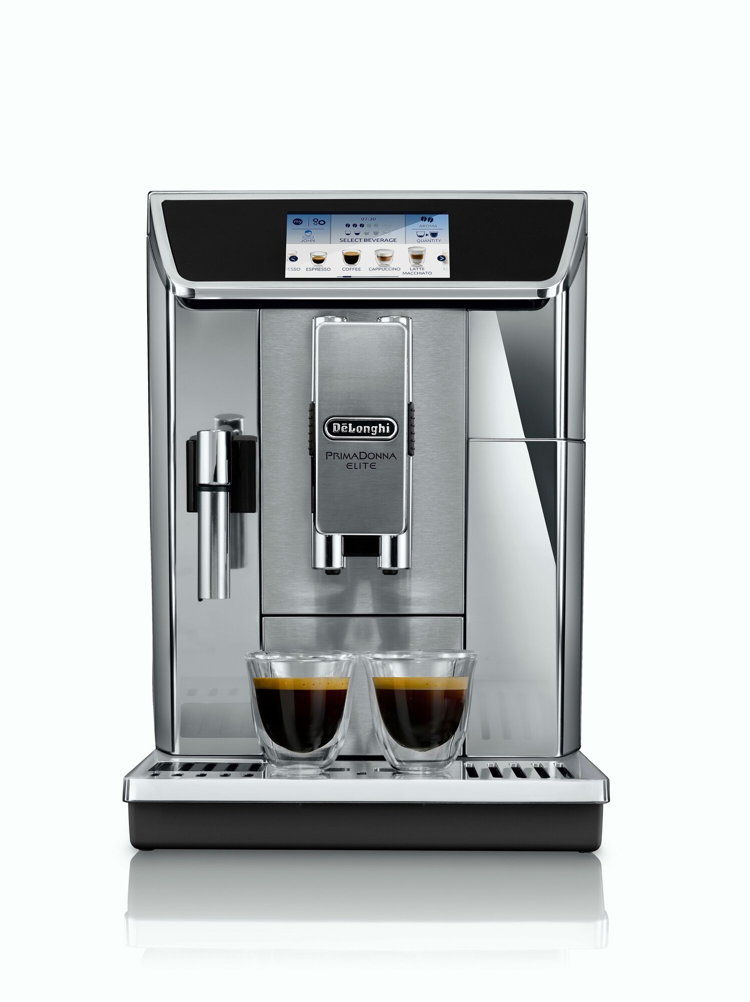 4.3" TFT touch display, 6 user profiles + guest mode, adjustable dispenser 90-142mm, milk container, chocolate container, preset hot chocolate and milk recipes, sound timer,