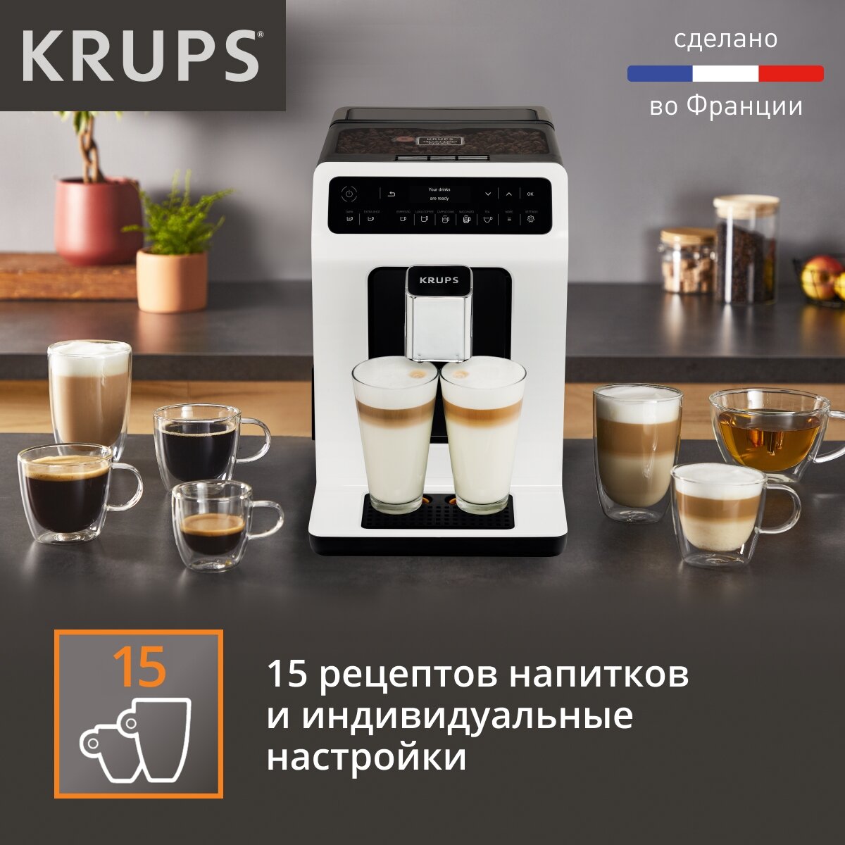 Automatic decalcification, auto shut-off when not in use, simultaneous preparation of two cups, hot water supply, pre-wetting