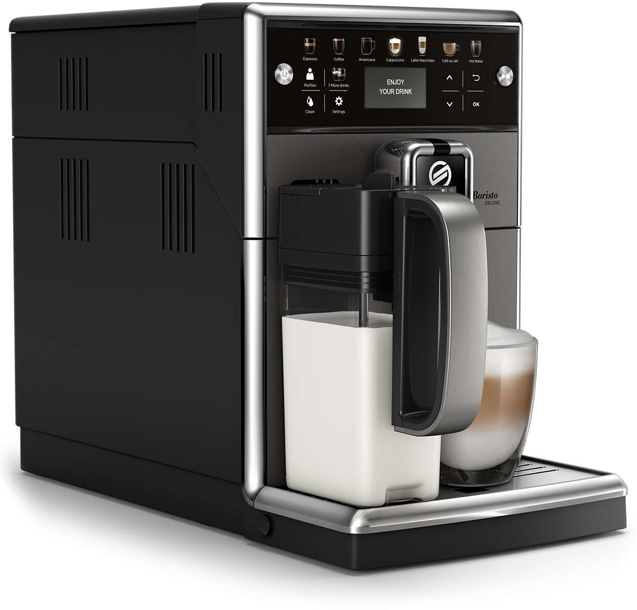 Automatic decalcification, rapid steam, simultaneous preparation of two cups, hot water supply